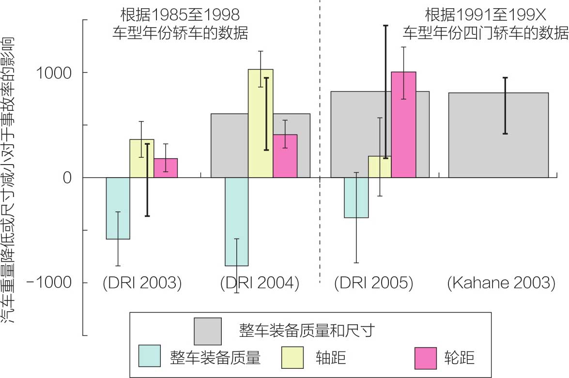 图1-21 事故死亡率与轿车尺寸/重量的相关性分析,纵轴为正表示汽车重量减轻或尺寸减小对于事故率的影响,正值表示事故率上升,负值表示事故率下降;图例中蓝色为重量,黄色为轴距,红色为轮距,灰色为同时考虑重量和尺寸