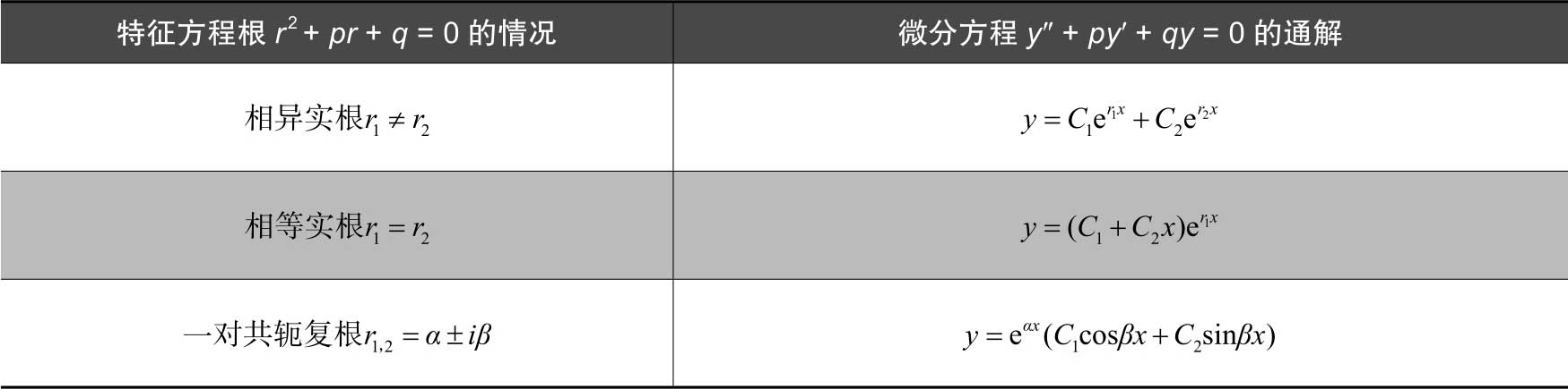 该方程是一个二阶常系数齐次线性方程。根据特征方程根的不同,二阶常系数齐次线性方程的通解可以分为以下三种形式,见表2-1。