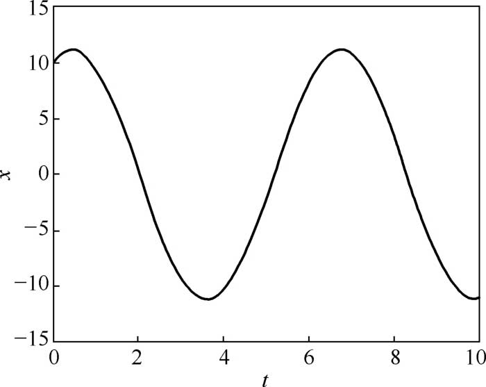 仿真结果分析:从图2-8和图2-10可以看出,该二阶常系数齐次线性方程的解是一条周期和振幅都保持不变的简谐运动曲线。通过手动计算得到的数值解和利用Simulink模块计算得到的解是相同的曲线。