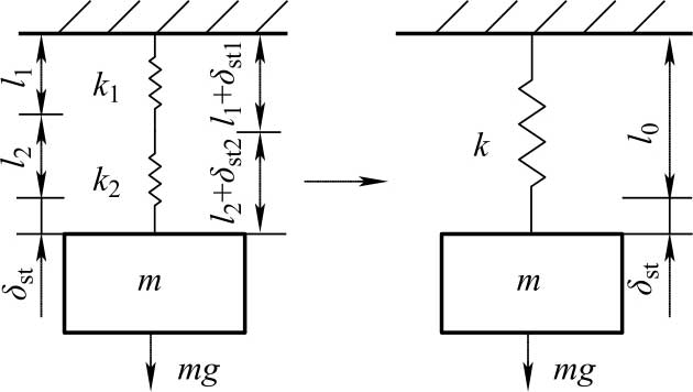 如果用一根刚度系数为 k 的弹簧来代替原来的两根弹簧,使该弹簧的静变形与原来两根弹簧所产生的静变形相等,则