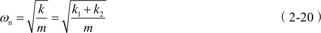 如图2-11所示的组合弹簧,两弹簧的两端同时连接于固定面上,又同时连接于质量块 m 上,这种形式称为并联弹簧。