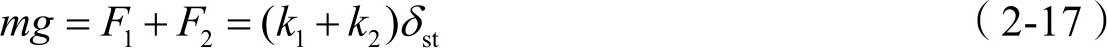 取平衡位置时的质量块作为研究对象,质量块 m 受重力、弹性力作用处于平衡状态,两根弹簧的静变形都是 δ st ,弹性力分别为 F 1 = k 1 δ st , F 2 = k 2 δ st ,由平衡条件 ∑F x =0,可得