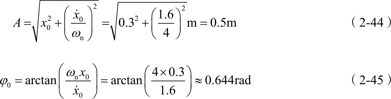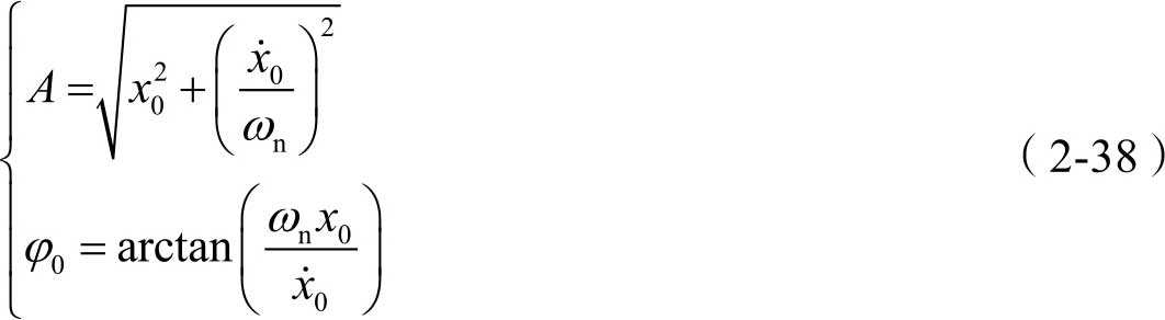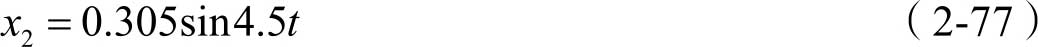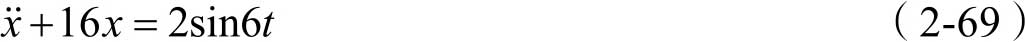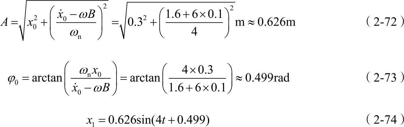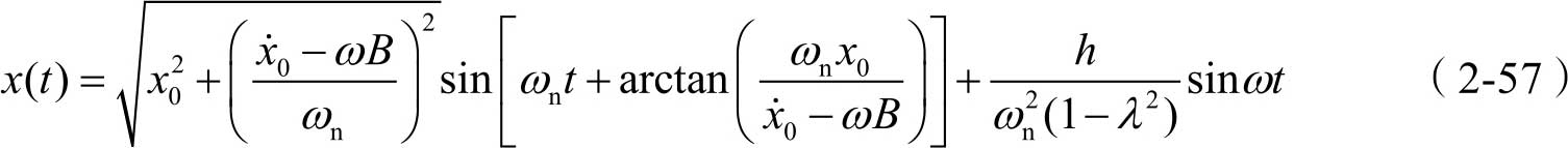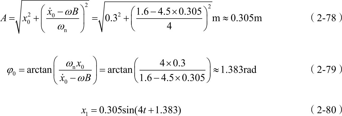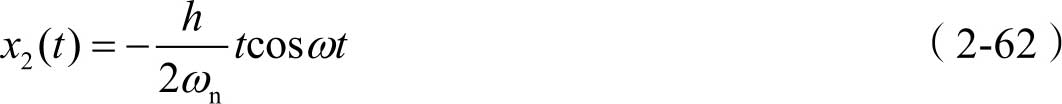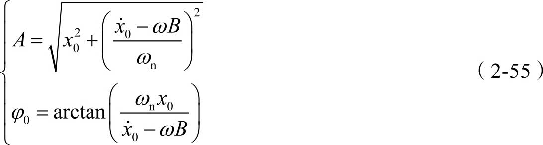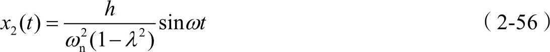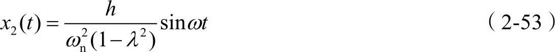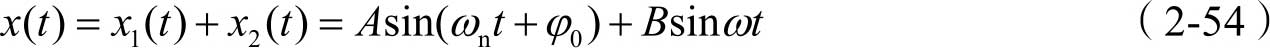 由式(2-37)可知,其通解可写为 x 1 ( t )= A sin( ω n t + φ 0 ),另外,式(2-50)中的特解 x 2 ( t )可写为