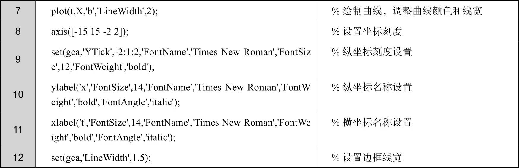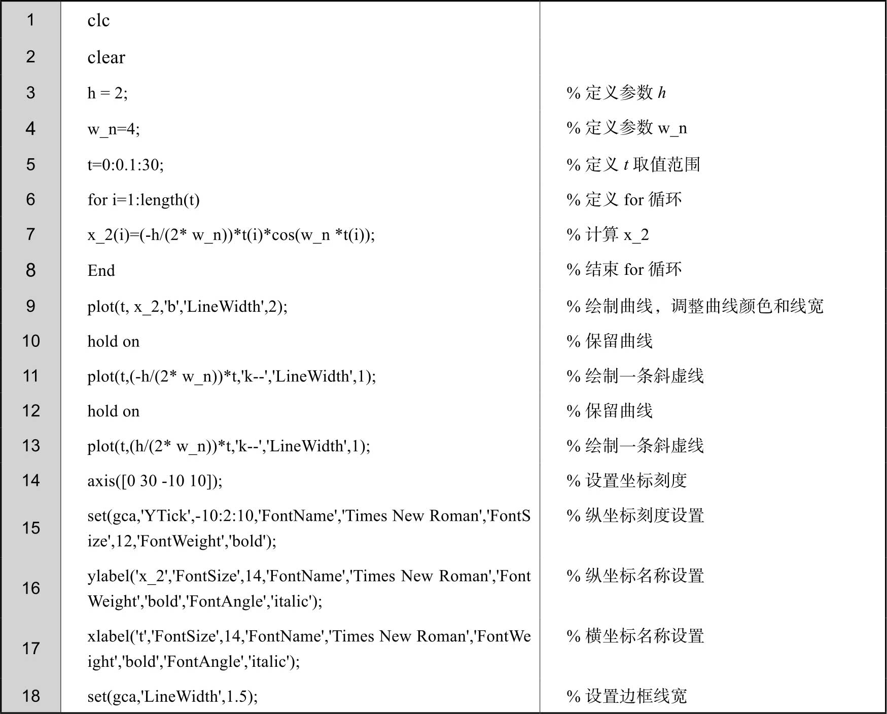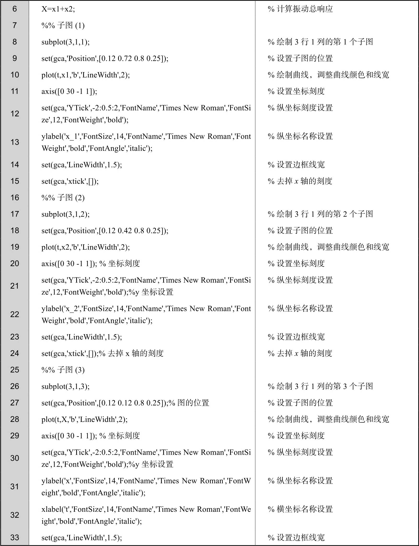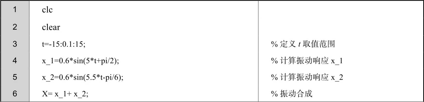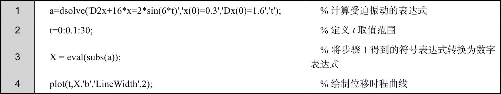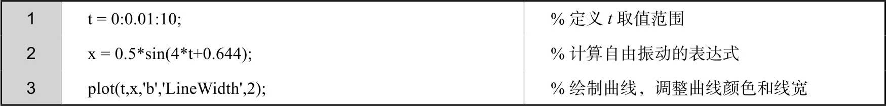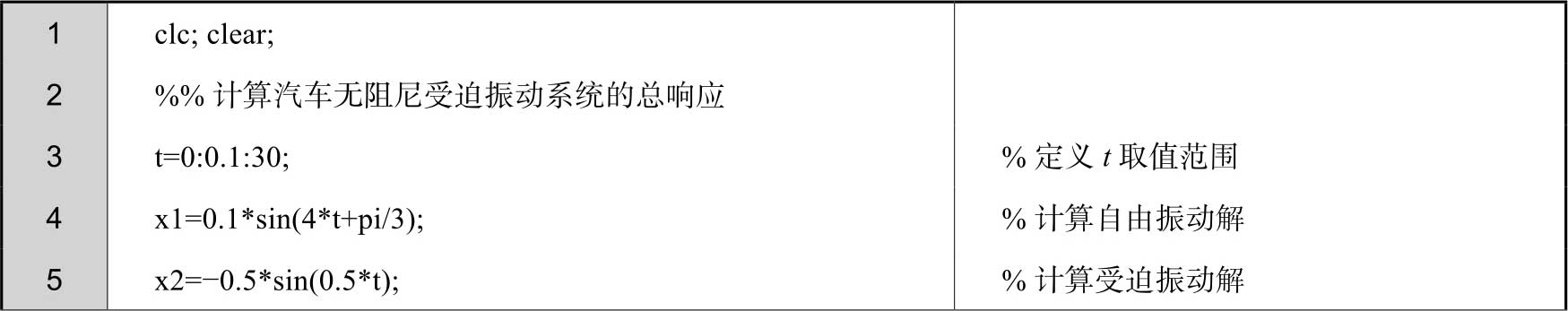 此外,由于前面已经求出了汽车无阻尼自由振动的表达式,因此可以在MATLAB的命令行窗口中直接进行求解,绘图程序如下。得到的位移时程曲线和图2-16相同,这里不再赘述。