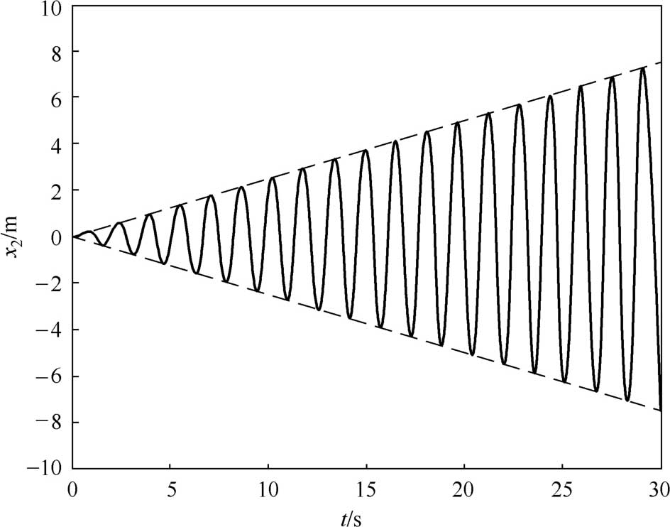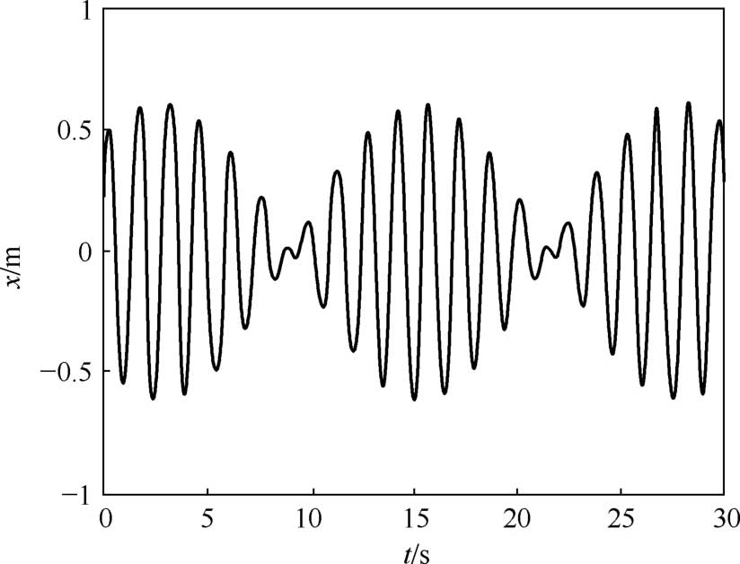式(2-66)中的正弦函数完成了几个循环以后,余弦函数才能完成一个循环。这是一个角频率为 ω 的变幅振动,系统的振幅会在0~2 A 之间缓慢地周期性变化。这种特殊的振动被称为“拍振”,其运动波形如图2-21所示。