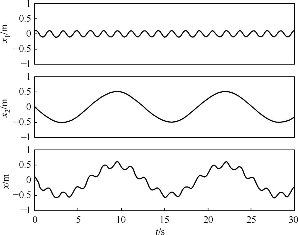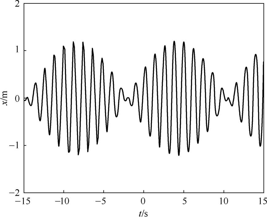可见,当 ω n 和 ω 之比是有理数时,汽车单自由度无阻尼受迫振动系统在简谐激振下的总响应是周期为 T 的复合振动,振动的周期是 x 1 ( t )和 x 2 ( t )振动周期的最小公倍数。