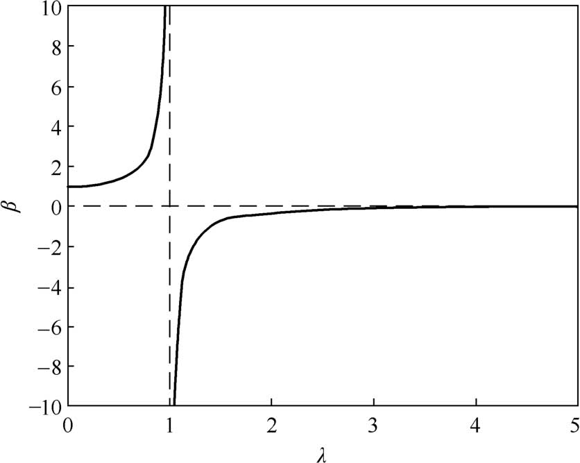 式(2-59)反映了振幅的放大因子 β 随频率比 λ 变化的规律,相应的曲线称为幅频特性曲线,如图2-19所示。无阻尼受迫振动系统的幅频特性曲线有如下规律: