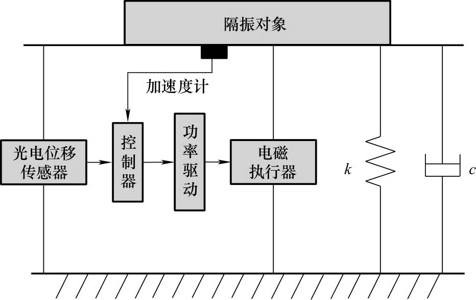 主动振动控制系统模型如图1-19所示。主动控制是指在机械结构振动发生之前,通过向机械结构施加力或力矩等外部调节信号来减少振动。主动控制需要一个能够产生预期输出的控制器,并且在适当时刻施加外部调节信号来补偿机械结构振动。主动控制器通常采用先进的电子技术和传感器来实时监测机械结构振动,并根据振动信息输出控制信号控制振动。这种控制需要消耗能量,而能量要靠能源来补充,通常有开环控制与闭环控制。闭环控制又称为反馈控制,是目前用得比较多的一种控制方法。主动式动力减振器有两种形式:一种是根据干扰力频率主动改变减振器的参数,如弹簧的刚度系数或阻尼器的阻尼系数,使减振器始终处于反共振状态,比如汽车上的半主动悬架系统;另一种是通过反馈主动减振器对需要减振的结构或系统产生最有利的振动抑制,比如汽车上的主动悬架系统。