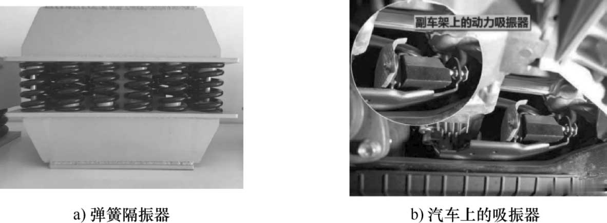汽车在行驶过程中由于受到不平路面的冲击以及零部件自身动作的影响,会产生较大的振动。为了保证汽车的行驶性能和各部件的正常工作,需要进行振动隔离,简称隔振。隔振可分为两类:一类是主动隔振,即用隔振器将振动隔离开;另一类是被动隔振,即将需要保护的设备用隔振器隔离开。这里的隔振器通常是由弹簧和阻尼器组成的模型系统。在实际应用中隔振器通常选用合适的弹性材料和阻尼材料,如木材、橡胶、轮胎、沙子等。比如在汽车中通常将橡胶减振产品用于动力总成、车身、底盘等各类结构件之间的弹性连接和缓冲。图1-16所示是弹簧隔振器和汽车上的吸振器。