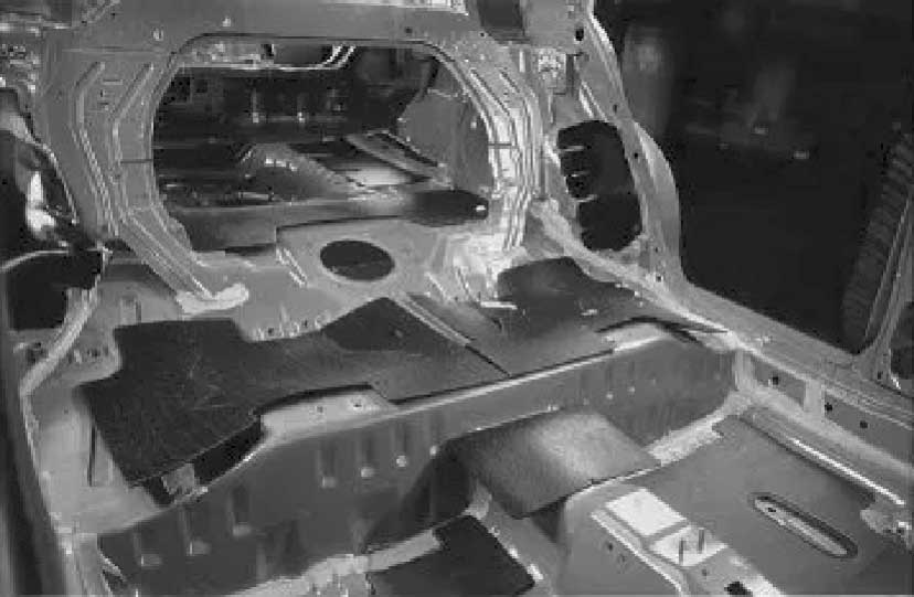 阻尼消振(也称为阻尼减振)方法是指利用阻尼器或阻尼材料来吸收或减小结构振动的能量,以达到减小结构振动幅度和防止结构损伤的目的。阻尼减振技术能降低结构或系统在共振频率附近的动响应强度。阻尼减振有两种方式:一种是集中力阻尼器,如各种成型的阻尼器;另一种是分布式阻尼器,如各种黏弹性阻尼材料以及复合材料等,主要应用于薄板和薄壳等薄壁结构和不宜施加集中阻尼力的系统,例如汽车地板上的沥青阻尼片,如图1-17所示。