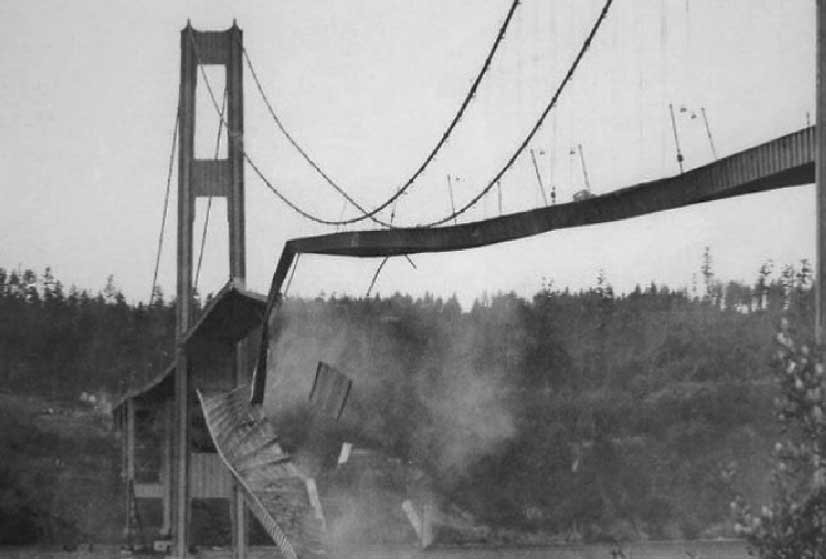 1940年7月1日,位于美国华盛顿州的悬索桥塔科马海峡大桥建成通车。可就在同年11月7日,刚刚建成通车的四个月后,大桥戏剧性地被一阵微风“摧毁”了(图1-18)。在大桥彻底倒塌前就已经发生过多次浮动,驾驶人在桥上行驶的感觉就像在水面上一样,因此,大桥被当地人起名为“舞动的格蒂”。而造成大桥倒塌的原因是采用了较薄的主梁,桥梁在风力的作用下形成了严重的卡门涡街效应,进而引起了桥梁共振。