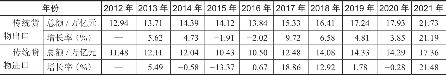 表1—1 中国传统货物进出口总额及增长率(2012—2021)