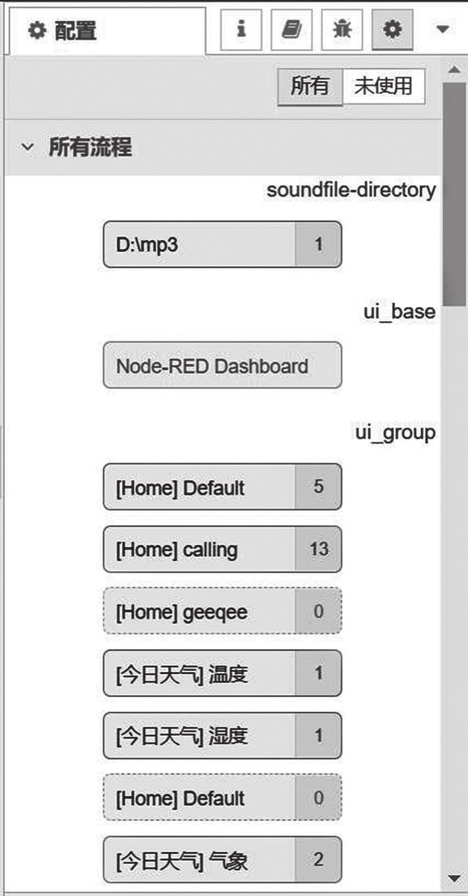 按钮才显示出来并再做进一步配置的节点。由于它们隐藏在第二层设置界面中,所以要看到和找到它们会比较困难。Node-RED在配置侧边栏统一展示所有配置节点,每个配置节点都显示其类型和标签,以及当前使用该配置节点的常规流节点数量,如图4-18所示。