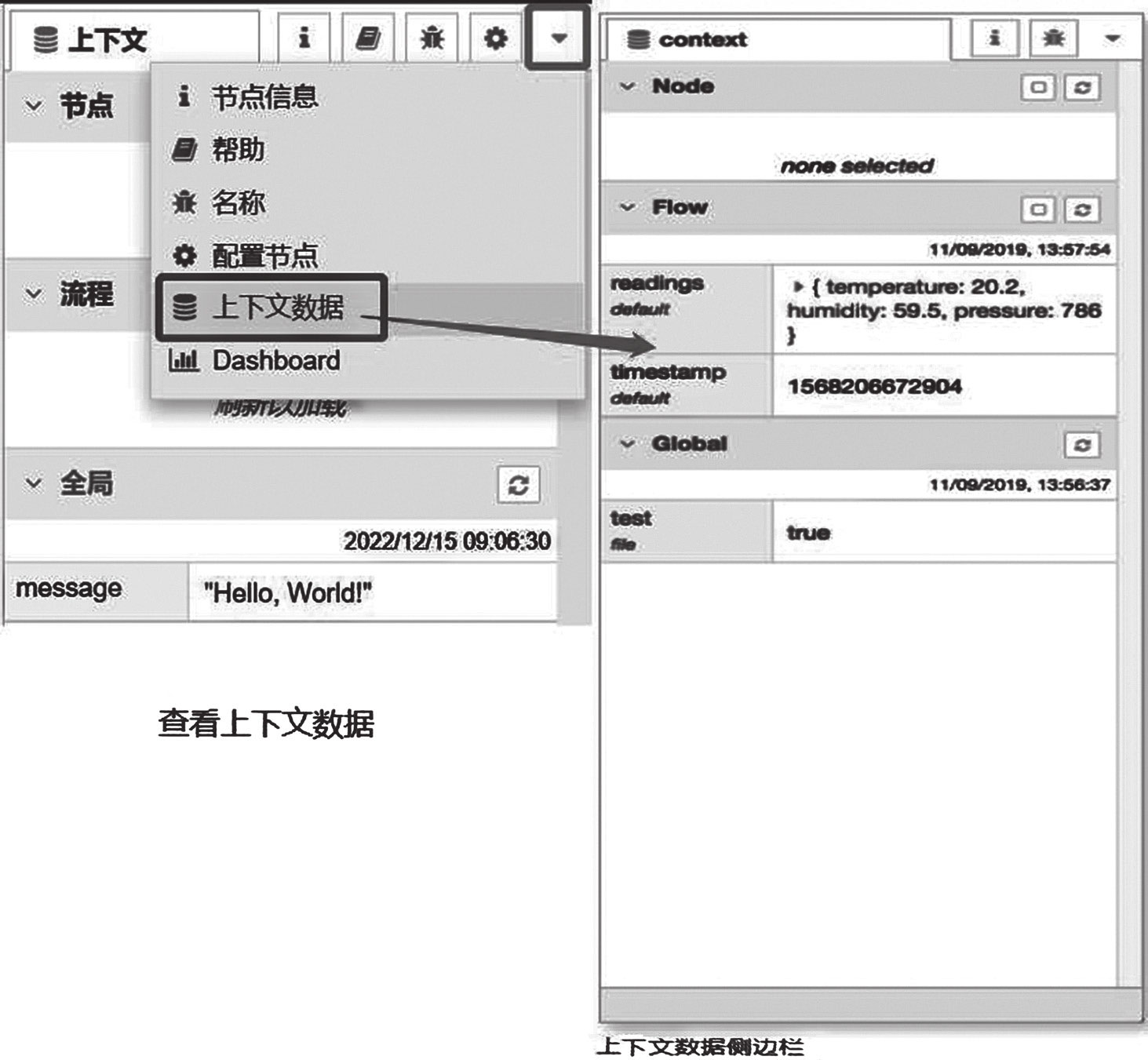 该面板分为3个部分,每个部分对应一个上下文范围:节点(Node)、流程(Flow)和全局(Global)。