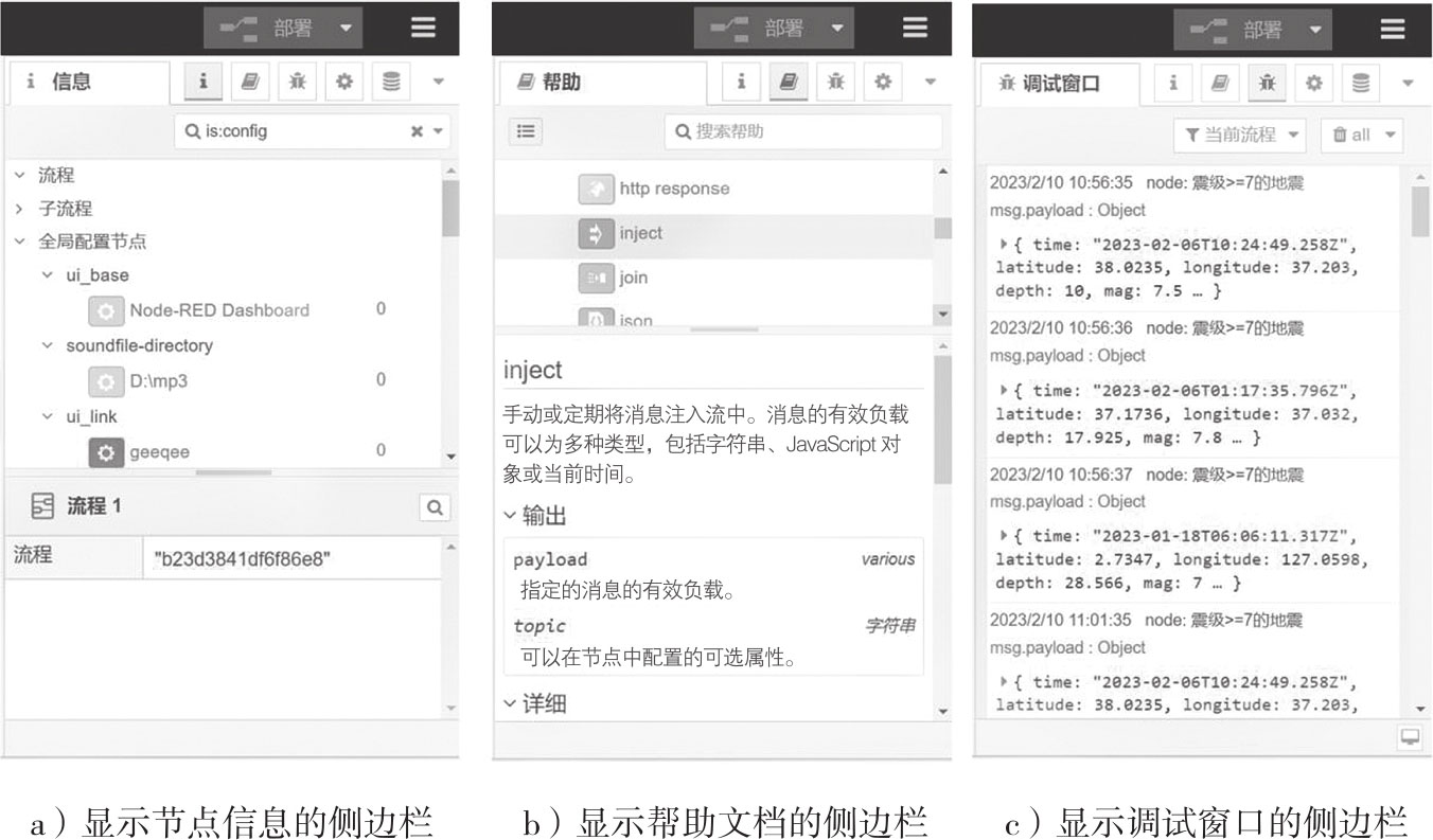 图4-11 侧边栏的节点信息、帮助文档和调试窗口界面