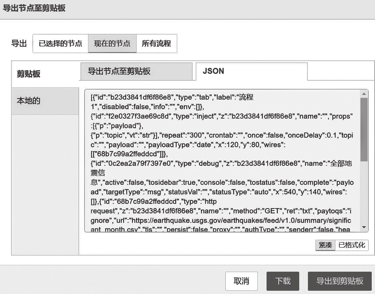 Node-RED可以导出已选择的节点、当前流程和所有流程,并且提供导出压缩或格式化JSON文本的选项。紧凑选项用于生成一行不带空格的JSON格式的字符串。“已格式化”按钮将JSON代码格式化为多行,并带有完整的缩进,这样更容易阅读,如图4-22所示。