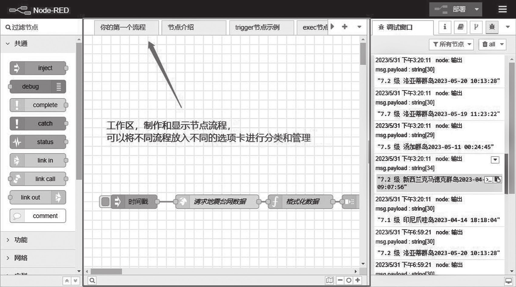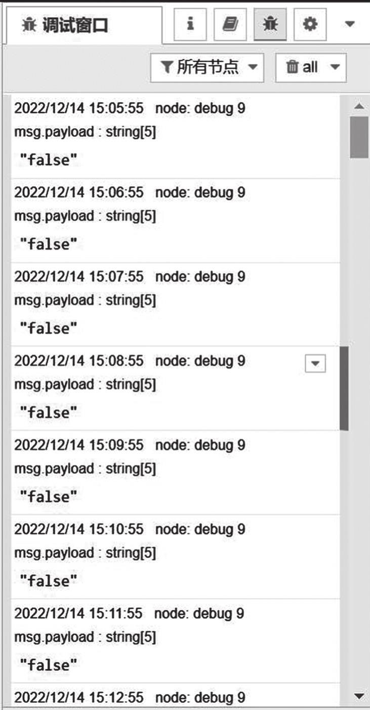 默认情况下,调试侧边栏显示所有debug节点打印出的调试消息,如图4-16所示。