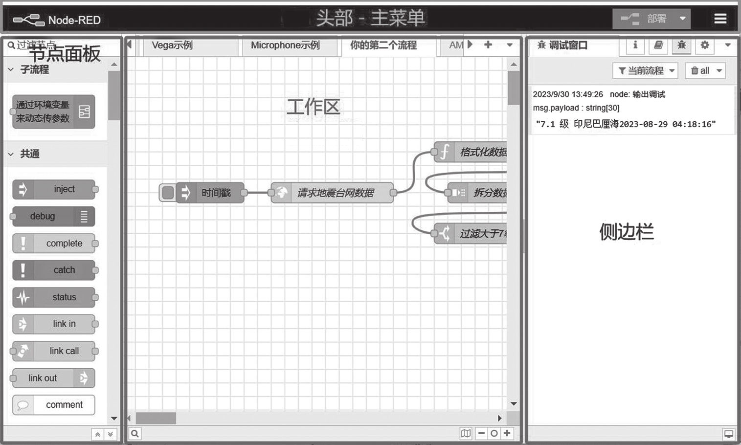 调试侧边栏显示传递给流程中debug节点的消息,以及运行时的某些日志消息。