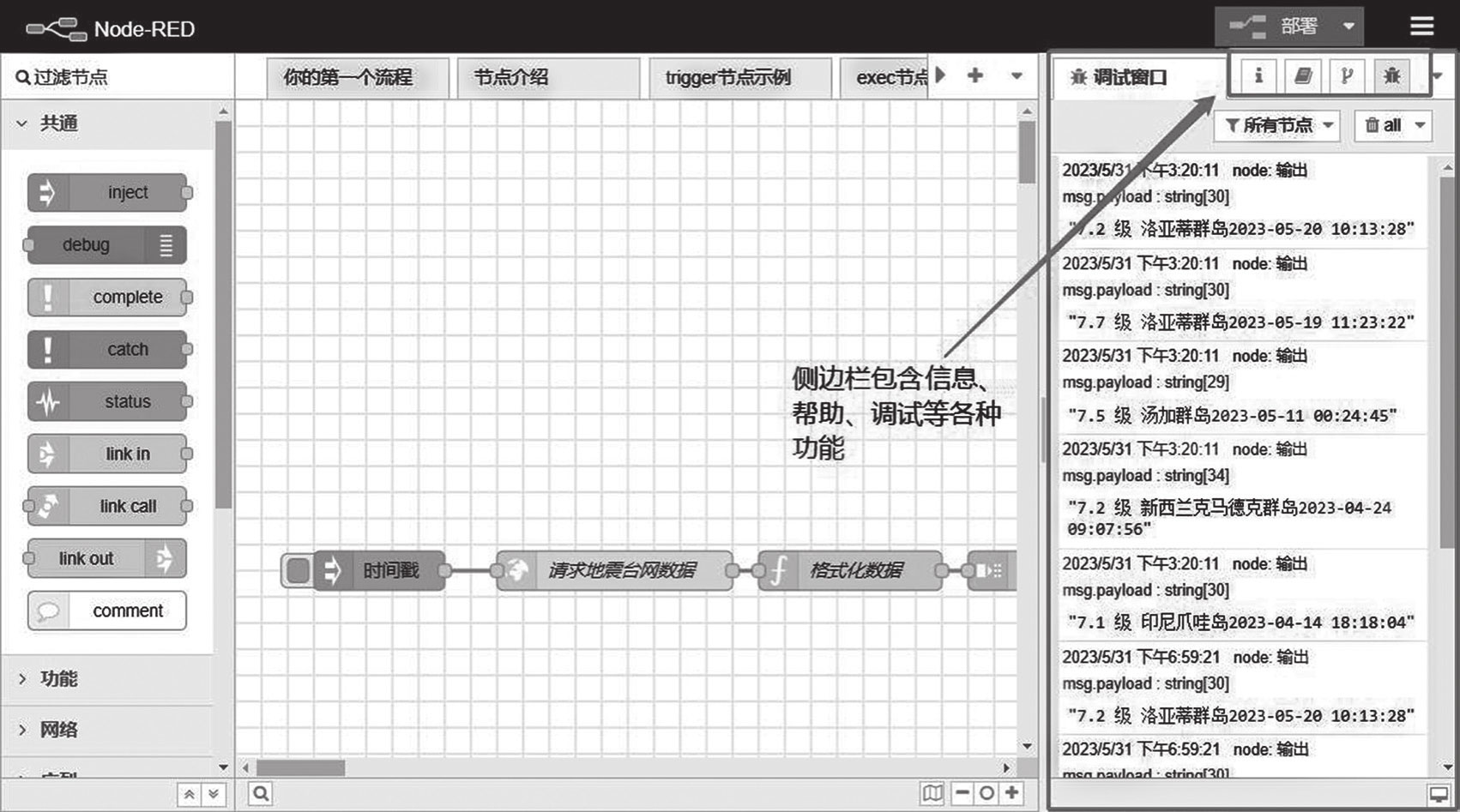 :调试边栏,可查看传递给debug节点的消息。
