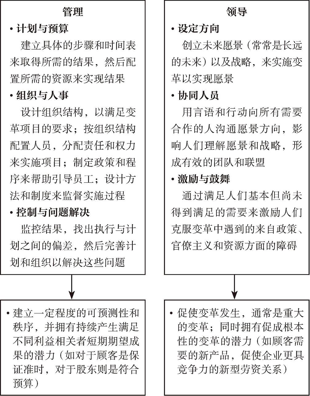 管理变革非常重要。没有强有力的管理,转型过程就会失控。但对于大多数组织来说,领导变革才是更大的挑战。只有通过领导才能冲破许多公司惯性的阻碍;只有通过领导才能激励人们做出重要的行为转变;只有通过领导才能使变革成果得以巩固,并使其融入组织文化。
