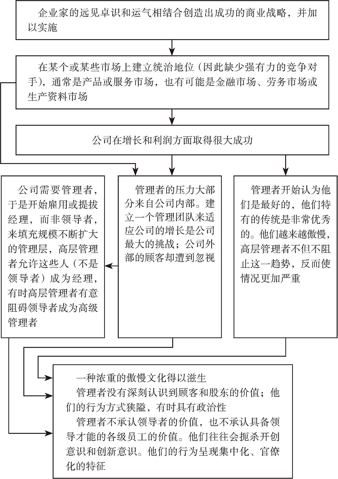 不幸的是,今天,这种对管理的重视常常被制度化地融入公司文化,从而阻碍了员工去学习如何领导。具有讽刺意味的是,导致这一结果的往往就是之前的成功。在研究了许多案例之后,我发现其形成过程是这样的:成功带来某种程度的市场领先,市场领先又促使组织继续增长;之后,控制这个规模越来越大的组织就成了公司的主要挑战。因此,注意力便转移到了内部,着重培养人员的管理能力。由于重点放在了管理能力而非领导能力上,官僚主义和关注内部的做法就占了上风。但是,随着公司持续取得成功,市场统治地位牢牢站稳,公司即使出了问题也得不到处理,一种不健康的自满情绪开始滋生。所有这些特点使变革变得更加困难(见图2-4)。
