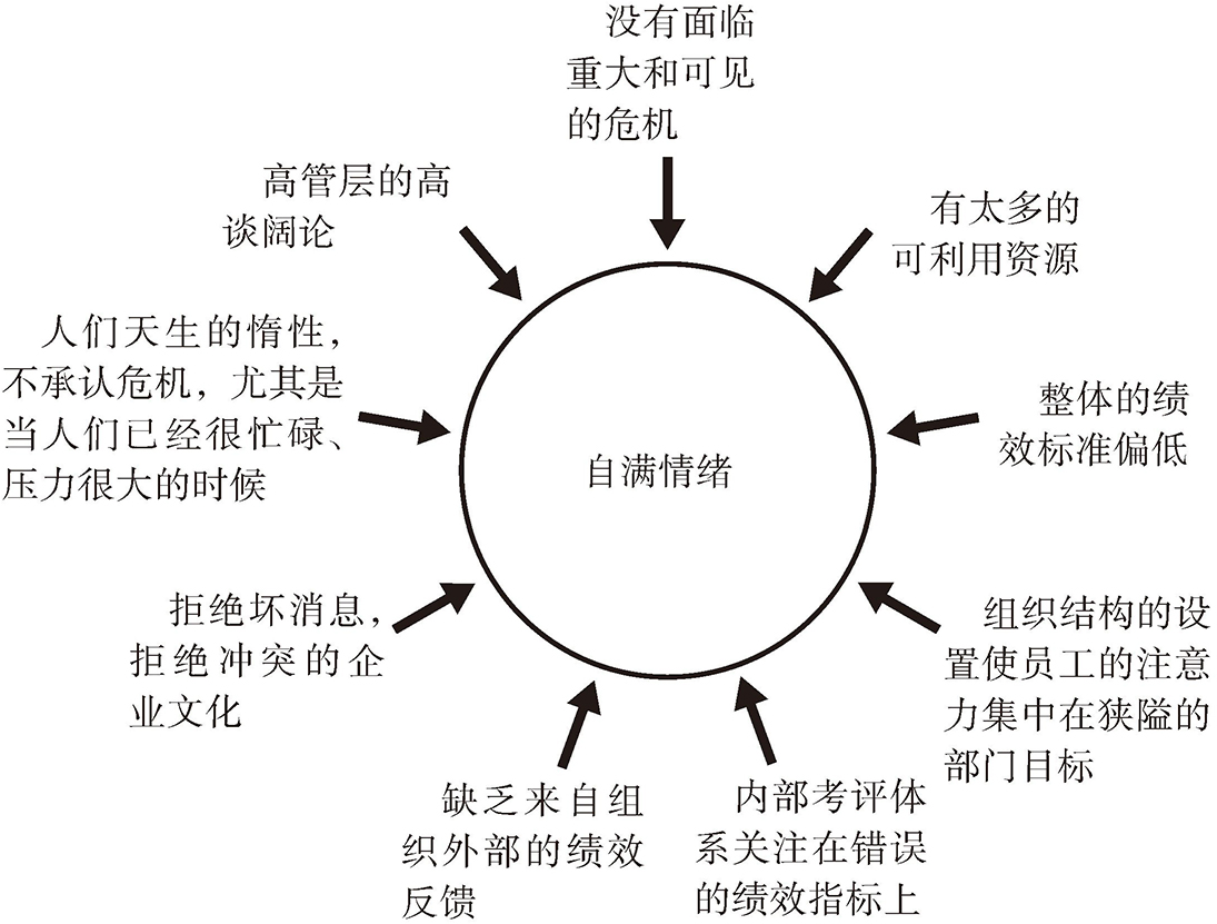 至少有九种原因可以解释这种自满情绪(见图3-1)。第一,没有面临重大和可见的危机。公司并没有亏损,没有人受到大规模裁员的威胁,也没有走到破产的程度,竞争对手还没打到家门口,媒体也没有无休止地报道关于公司的负面消息。作为一个理性的分析者,你也许会认为只有当公司的市场份额和利润正在不断下降时,才是面临着危机,但这是另一个问题。这里说的是:员工并没有看到实实在在的威胁,这是他们没有紧迫感的原因之一。