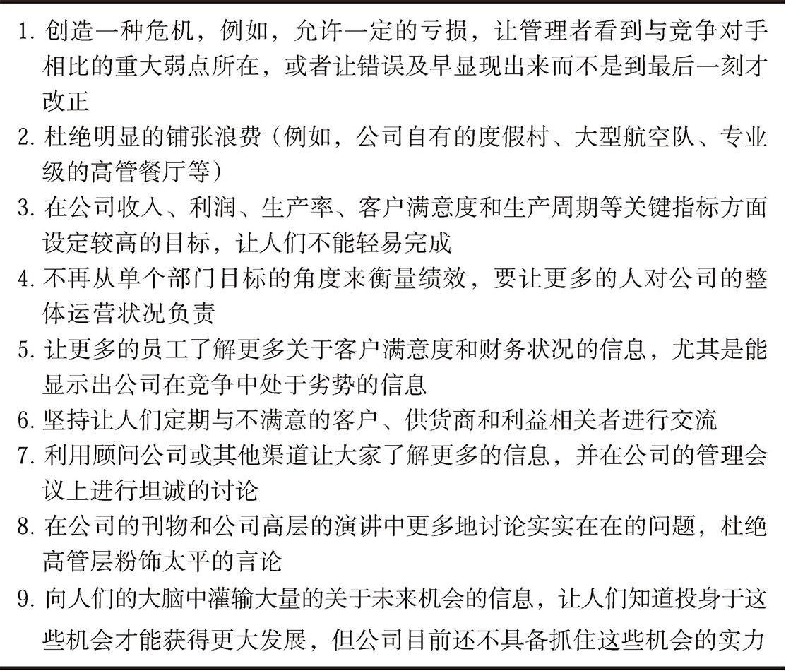 树立强烈的紧迫感通常需要采取大胆甚至冒险的行动,而这通常都需要优秀的领导力。一些温和的行为,例如,邀请客户代表参与年度管理会议,面对自满情绪所迸发出的压倒性的强大力量,也只能以失败告终。大胆的行为,意味着清理资产负债表,应对当前季度的巨大亏损,卖掉公司总部,搬到更像作战指挥中心的地方去办公;或者告诉所有业务条线,它们必须在两年的时间内成为市场上的数一数二,否则就撤销或关门;或者最高层的十位管理者,只有在公司达到某个有挑战性的产品质量标准后,才能拿到另一半的薪酬;或者聘请咨询公司去收集真实的信息并在会议上讨论,尽管你也知道这样的战略会使某些人感到极不舒服(九种增强紧迫感的方法如表3-1所示)。