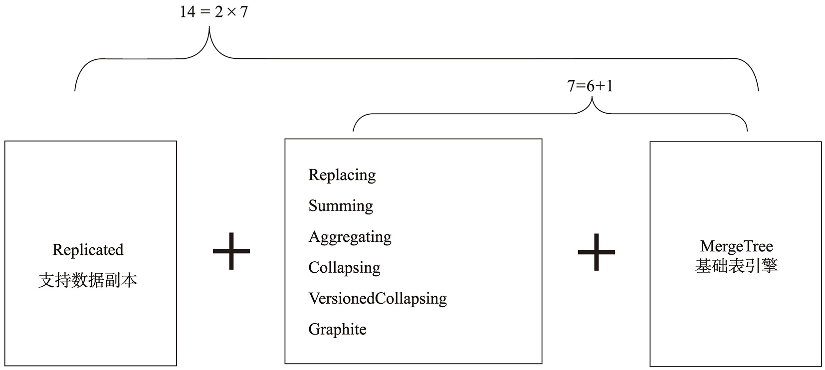 同时为了保证数据的冗余,ClickHouse提供了Replicated机制,构成了14种MergeTree的变种,满足日常应用的需求。对应的14种存储引擎如图3-9所示。
