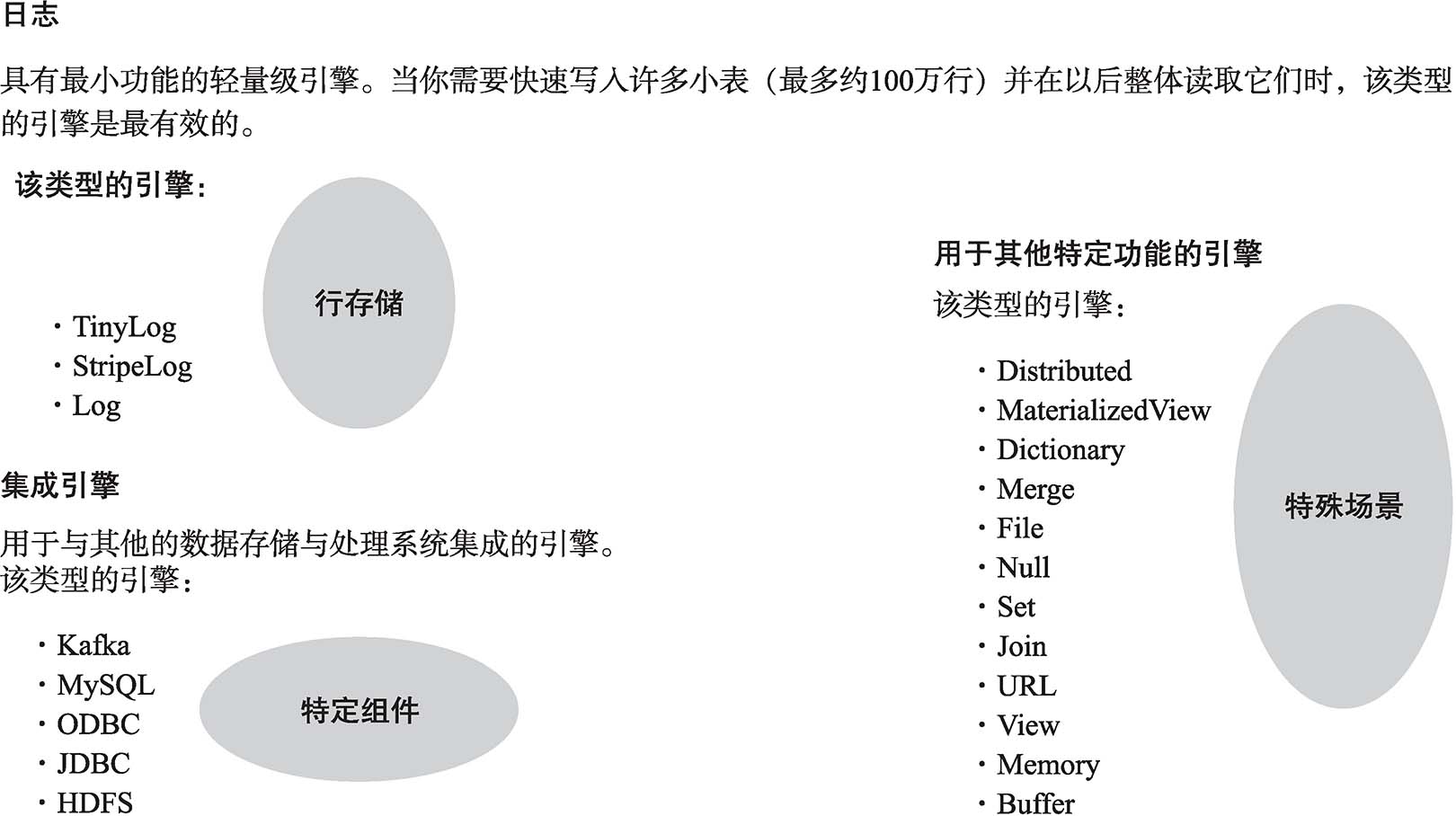 此外,由于ClickHouse是以自下而上的方式进行开发的,因此它也提供如下几种基于行、基于组件连接以及基于特殊应用场景的存储引擎,如图3-10所示。