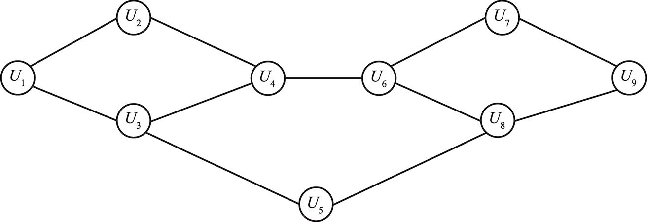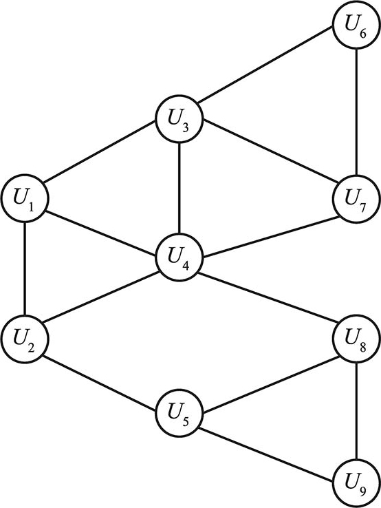 1)设节点 U 1 和 U 4 组成一个行为 A 的初用节点集 S ,如果其他节点遵循门槛规则选择行为,那么哪些节点最终会转向行为 A ?