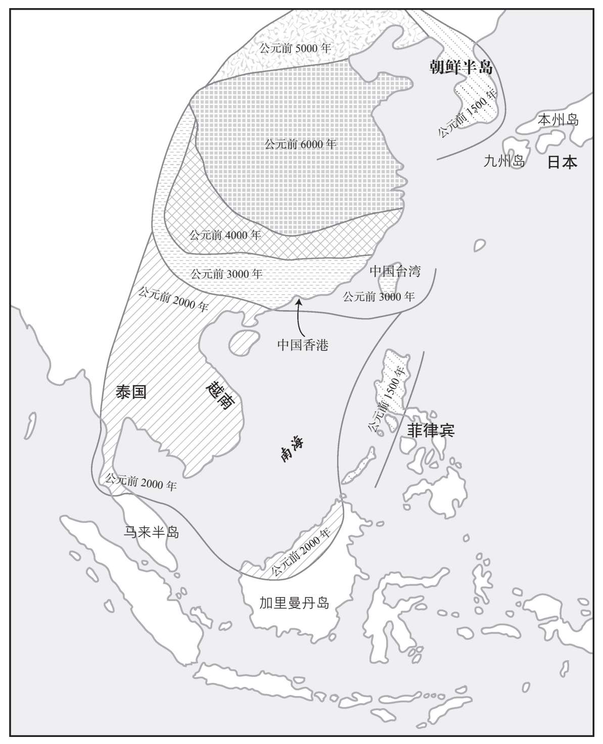 同样,当我提及“东方”时,指的是人类在欧亚大陆最东部最早开始驯养生活的核心地区,即黄河和长江之间的地区,也是通过一系列的扩张和竞争而发展和扩张的那些社会。像在西方一样,驯养生活促使人口增长,同时推动了社会向前发展和人口向外扩张。到公元前2000年时,“东方”扩展至包括了我们今天称为东南亚的大部分地区。到公元前1500年时,“东方”又囊括了今菲律宾和朝鲜半岛(图2.3),在公元第一个千年中又吸纳了日本。