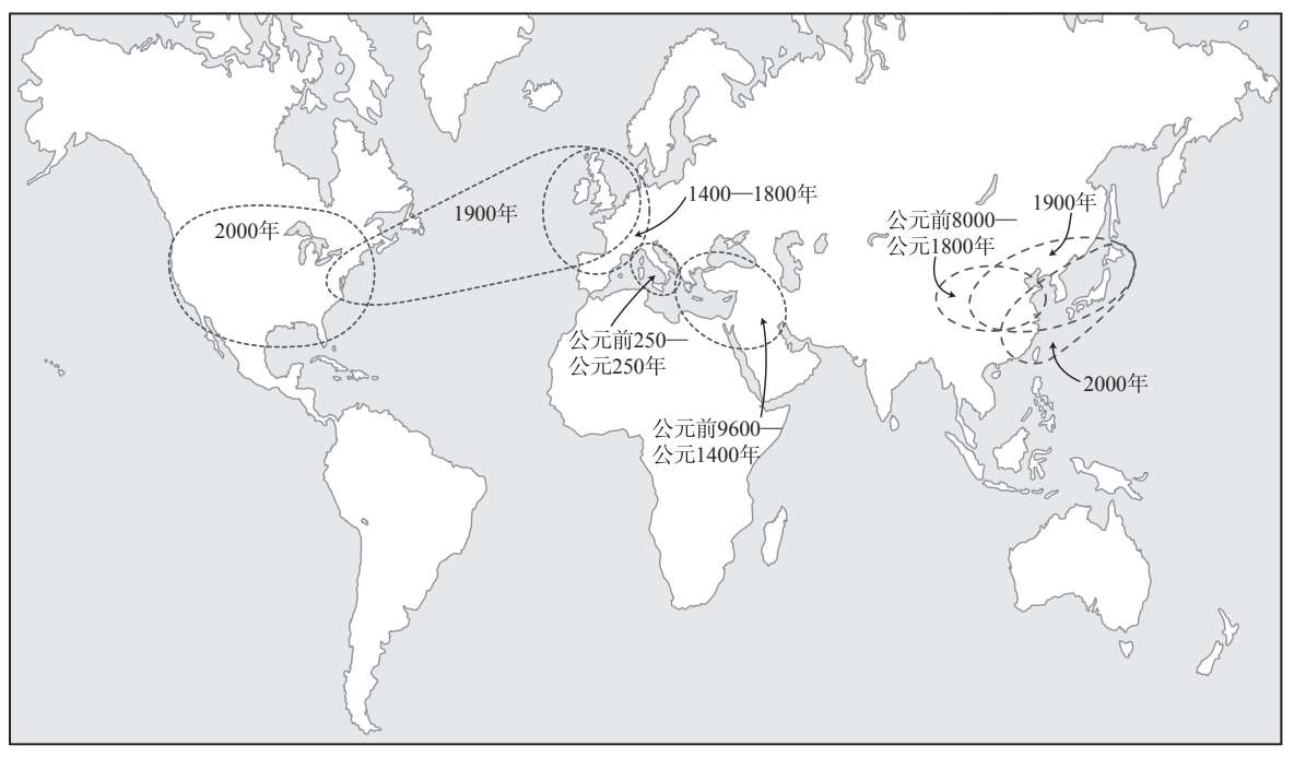 随着时间推移,这些核心地区发生了极大的迁移和变化(图2.4)。从公元前11000年至约公元1400年,西方的核心地区在地理上非常稳定,一直安于地中海的东端,除了约公元前250—公元250年的500年间,罗马帝国向西扩张,将意大利纳入自己的版图。否则,西方的核心地区就始终维持在今伊拉克、埃及和希腊形成的三角形内。自1400年起,这一核心地区不断地向北方和西方迁移,先到达意大利北部,继而到达西班牙和法国,然后又扩张至英国、低地国家和德国。1900年,该核心地区跨越了大西洋。到2000年时,它牢牢地在北美洲扎了根。