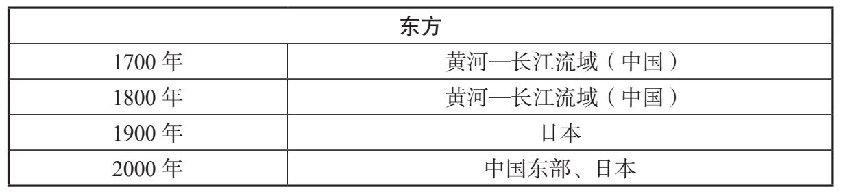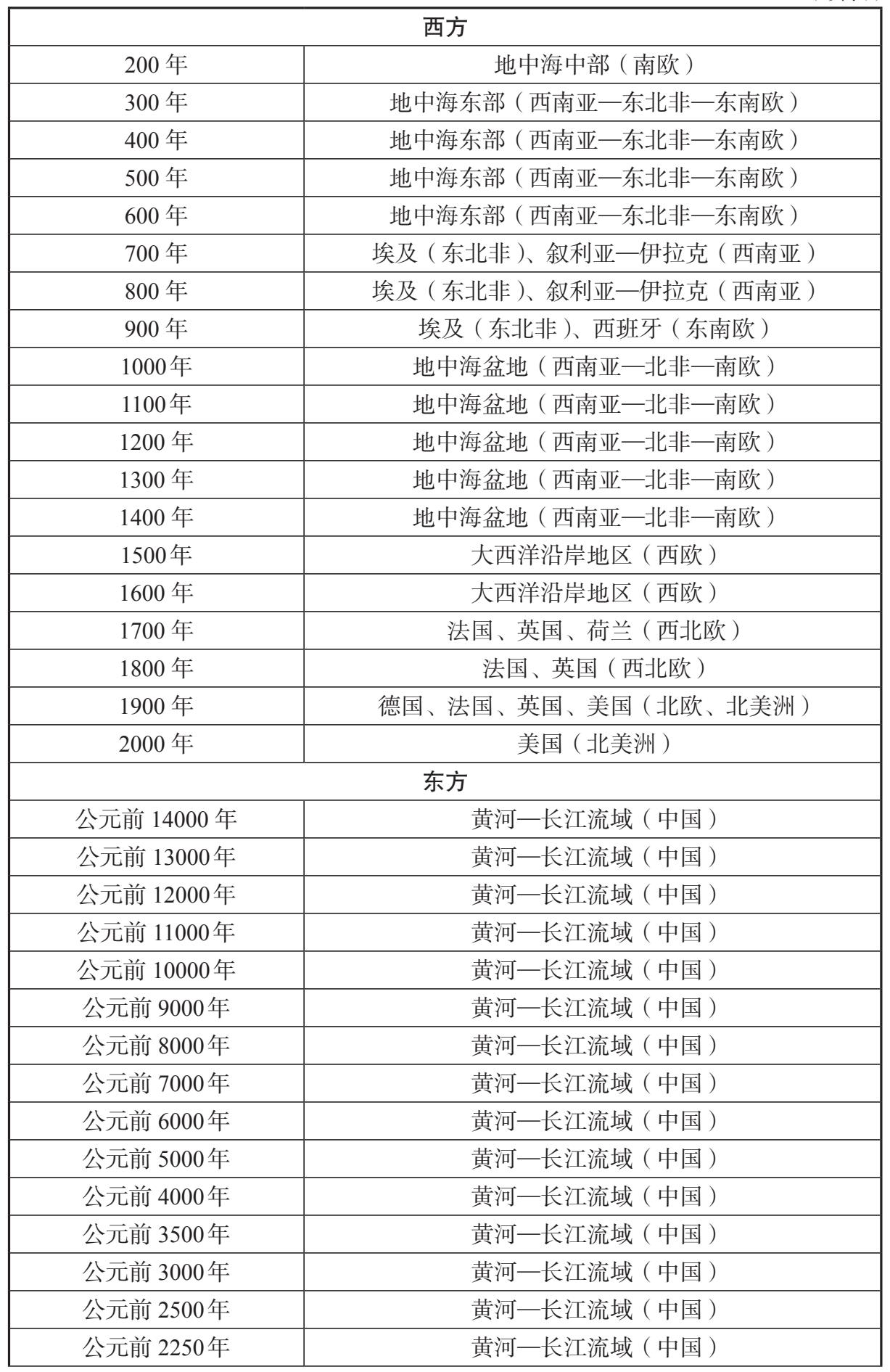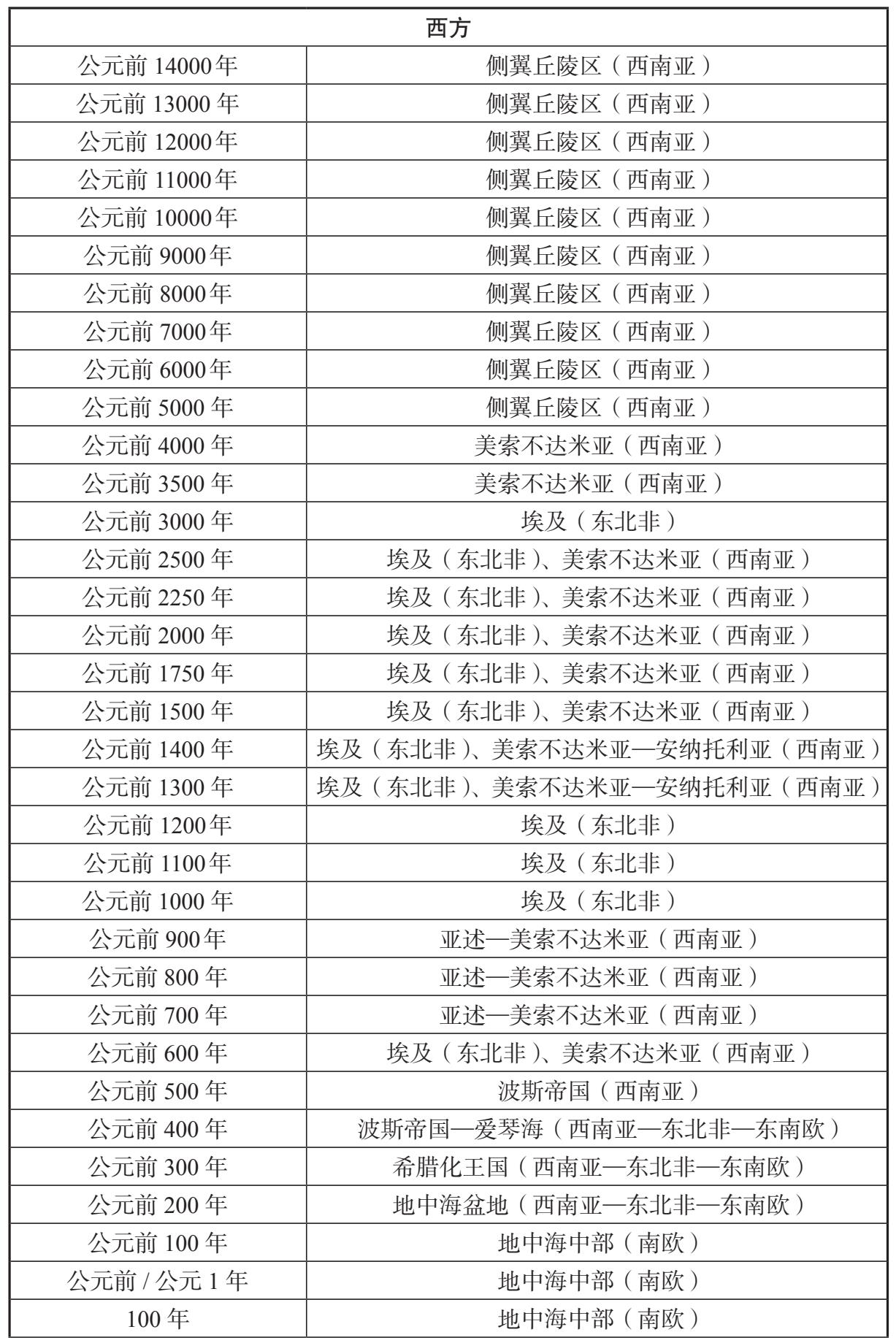 表2.1 公元前14000—公元2000年,西方和东方的核心地区