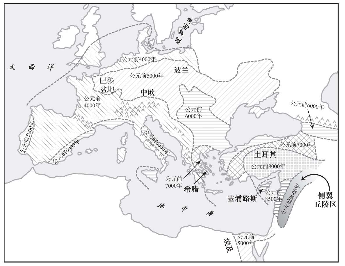 图2.2 西方的早期扩张,公元前9000—前4000年