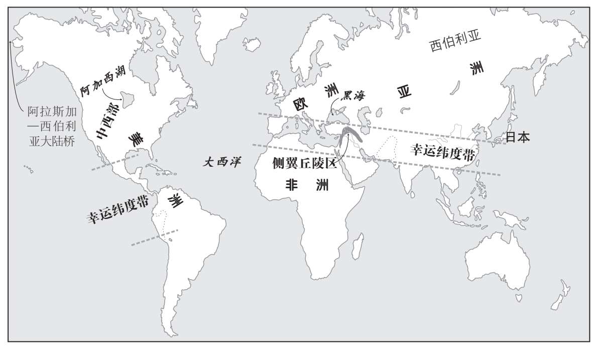 为了避免这种民族优越感,我做出了极其不同的假设。我并非建立一些我认为属于西方的价值,再沿时间回溯,而是一开始就着眼于故事开端,再向后展望。地区之间生活方式的根本不同,实际上只是在最后一个冰期结束后才开始发展起来的。当时一些群体开始栽培植物、驯化动物,而另一些群体仍在延续着狩猎和采集的谋生手段。 [7] 正如我在《西方将主宰多久》的第二章 [8] 中所解释的,我对“西方”的定义是,人类在欧亚大陆最西部最早开始驯养生活的核心地区,即底格里斯河和幼发拉底河的源头地区,通过一系列殖民和竞争而发展和扩张的社会。