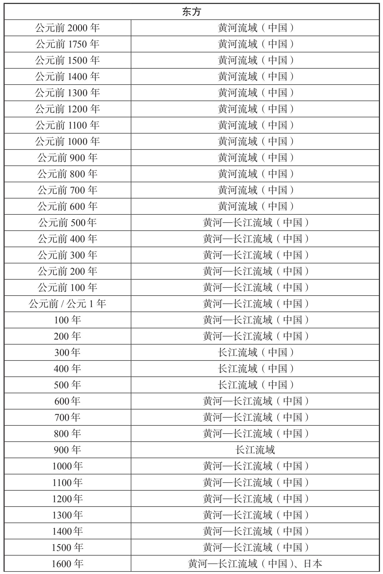 在东方,其核心地区始终保持在最初的黄河—长江地带,一直到1850年。尽管大约公元前4000年后,重心北移至黄河流域的中原地区,公元500年后又回到了南方的长江流域,公元1400年后再次逐渐北移。到1900年时,该核心地区将日本纳入其中,到2000年时又将中国东南部纳入其中。