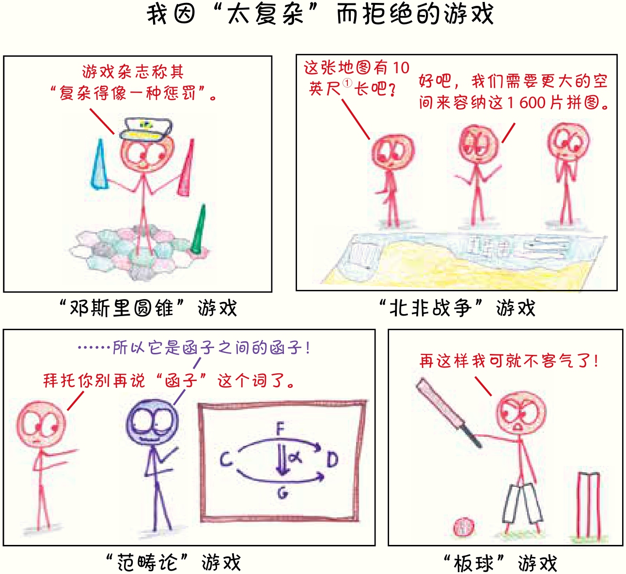 (2) “数学游戏”具体指的是什么? 这是个好问题。第一个问我这个问题的是维托·索罗(Vito Sauro),他是明尼苏达州最友善的桌游专家之一。他指出,几乎所有桌游都是由数学框架和某种主题的外壳构成的,所以我这本书会涵盖所有已经问世的游戏吗?