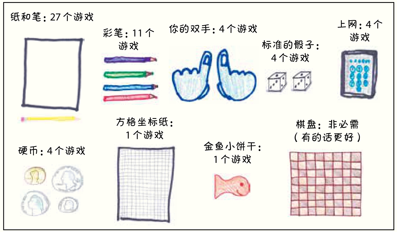 (2) 玩伴。 很多数学书里的游戏都是一个人单独玩的,但本书不是。我写这本书时,正值由新冠肺炎疫情引发的保持“社交距离”(social distancing)被提出的那一年,于是它就成了一封写给社交与聚会的情书。除少数单人游戏外,你是需要玩伴的。此外,虽然本书是为像我这样的“黑猩猩大宝宝”而写的,但满10岁的孩子基本上就可以玩书中所有的游戏了,甚至还有很多游戏适合6岁左右的孩子。