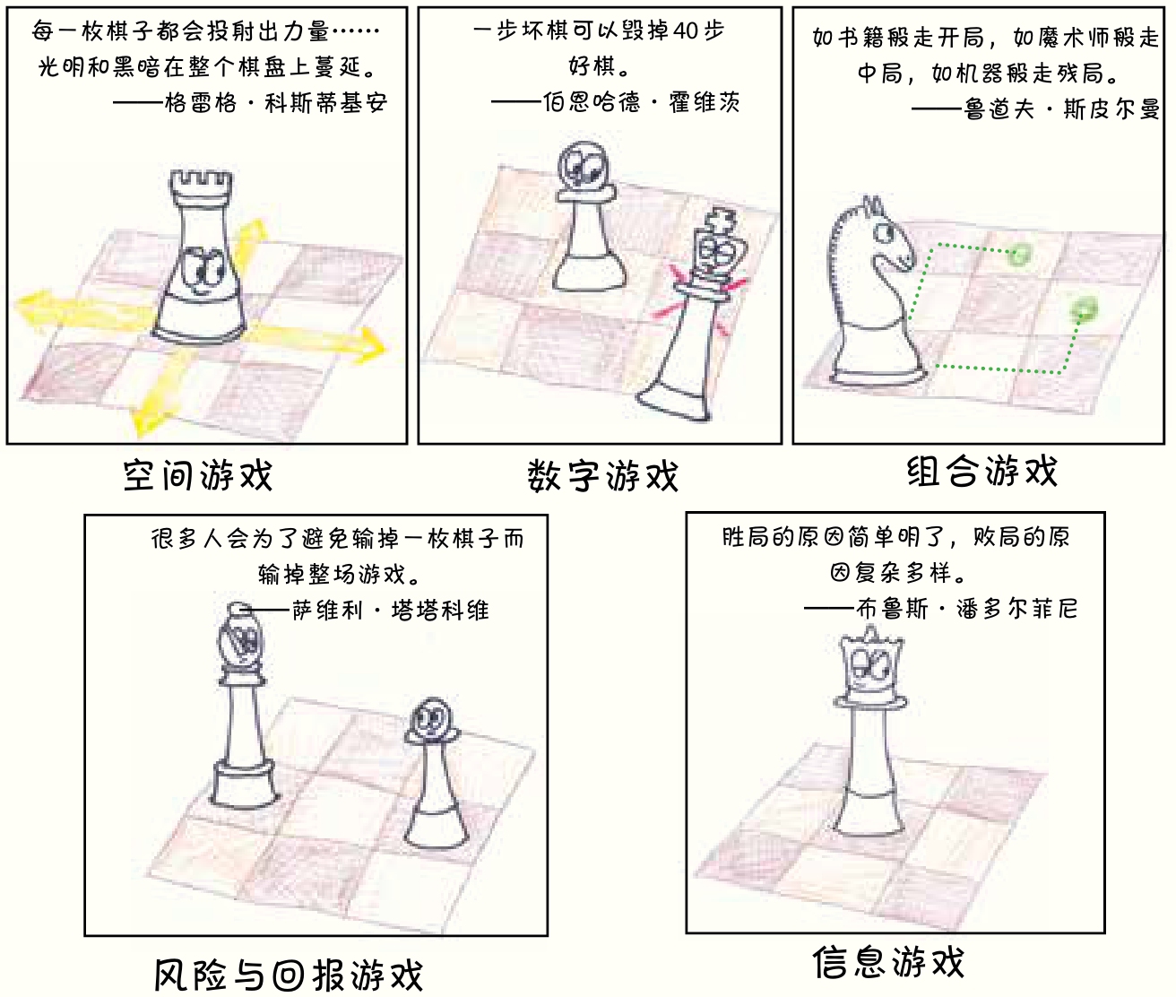 (3)这本书介绍了5大类游戏: 空间游戏、数字游戏、组合游戏、风险与回报游戏,以及信息游戏。 以上分类只是我的灵光一现,并不严谨,切勿将其看作每个样本都能被归档的完美分类学。它们更像是一种氛围灯,用于突出游戏鲜明的特征。例如,国际象棋可以被归为这五大类中的任意一类,它在不同的光源下看起来略有不同。