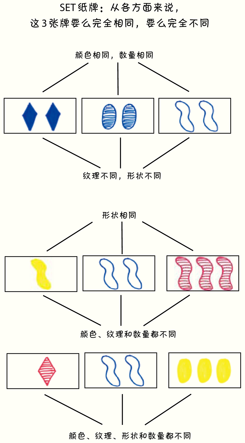 就这样,史蒂芬·霍金(Stephen Hawking)最喜欢的消遣方式、顶尖数学家最喜欢的研究课题,以及20世纪最受欢迎的纸牌游戏之一——SET纸牌——诞生了。