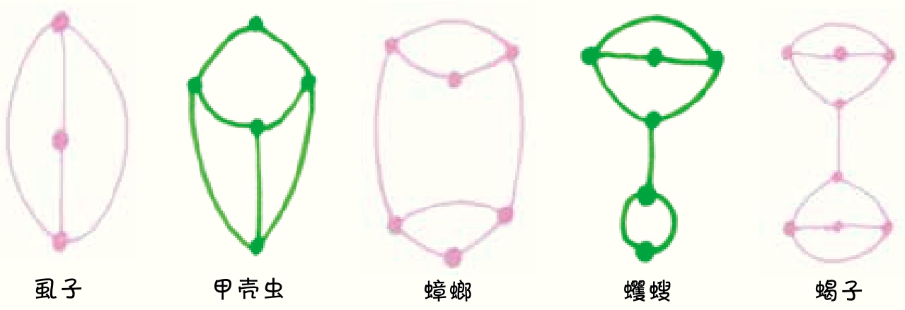 拓扑学是奇异的。 以下是约翰·康威给出的一个有趣结果。如果想让抽芽游戏的步数最少,那么游戏结束时必然呈以下形状之一: