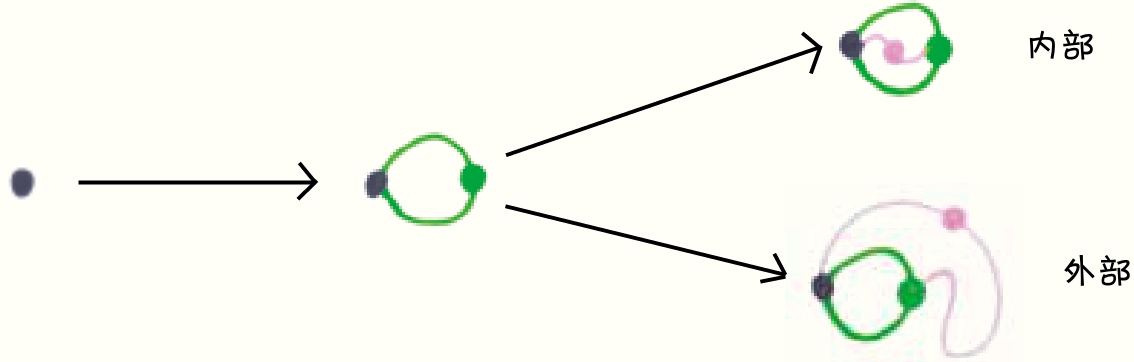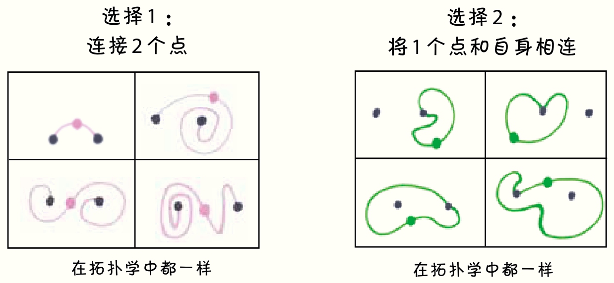 2个点的抽芽游戏是什么样的呢?从拓扑学的角度来看,玩家在开局只有两种选择:把2个点连起来,或者将其中一个点和自身相连。不管把另一个点留在“外面”还是“里面”,都无关紧要,因为在拓扑学中,这2种情况都一样。
