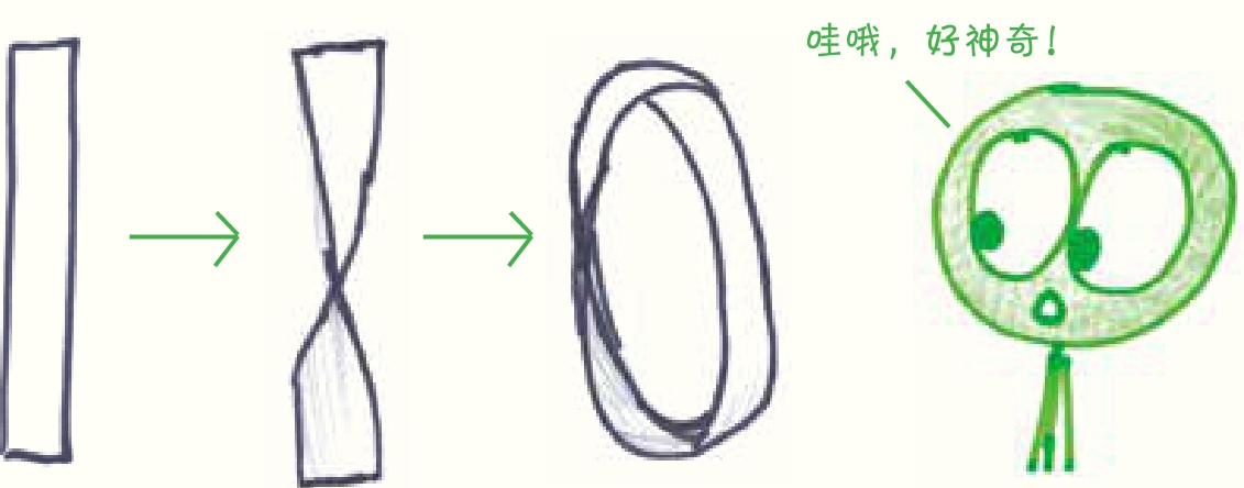 莫比乌斯环没有“内外”之分。如果你想给它像手镯一样上色,即蓝色的部分朝向手腕,红色的部分朝外,你是不会成功的。无论先涂哪种颜色,最终这种颜色都会覆盖环的整个表面。这只是它的特性之一。如果你把一条莫比乌斯环从中间剪开,会发生什么?如果把它剪成3段呢?