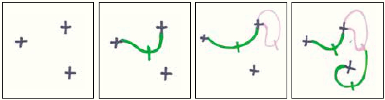 (1)在每个回合中,玩家轮流用一条平滑的线 连接2个点(或将一个点与它自身相连) ,并在自己刚刚画的那条线上 标注一个新的点 。