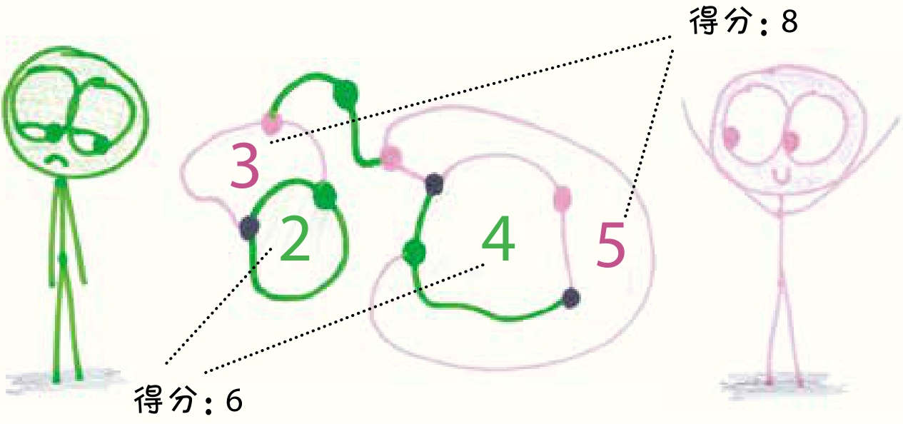 在沃尔特·尤里斯设计的这个变体游戏中,除了你可以通过占领区域获得分数,其他规则与抽芽游戏一样。如果你画线后创建了一个封闭区域,就用你的初始值或颜色标记它,此区域边界上的每个点都可以得1分,此后不得在该区域内再做任何操作。当最后无路可走时,得分最多的人获胜。