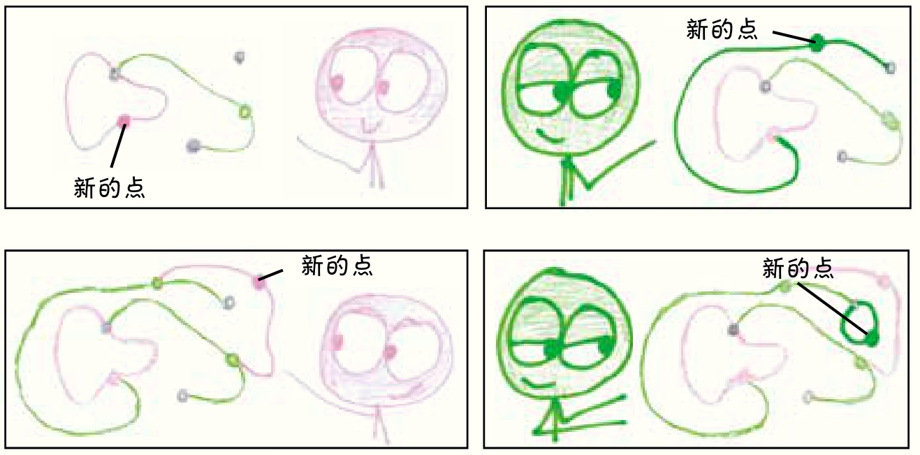 最后一个问题由你这个宠物主人做决定。但说到抽芽游戏,不必担心,并不是所有的步骤都是一样的。事实上,在2个点的抽芽游戏的第二步,你已经面临6种不同的拓扑选择。所以自此,你便获得了选择的自由。