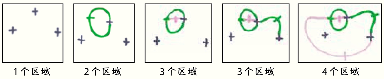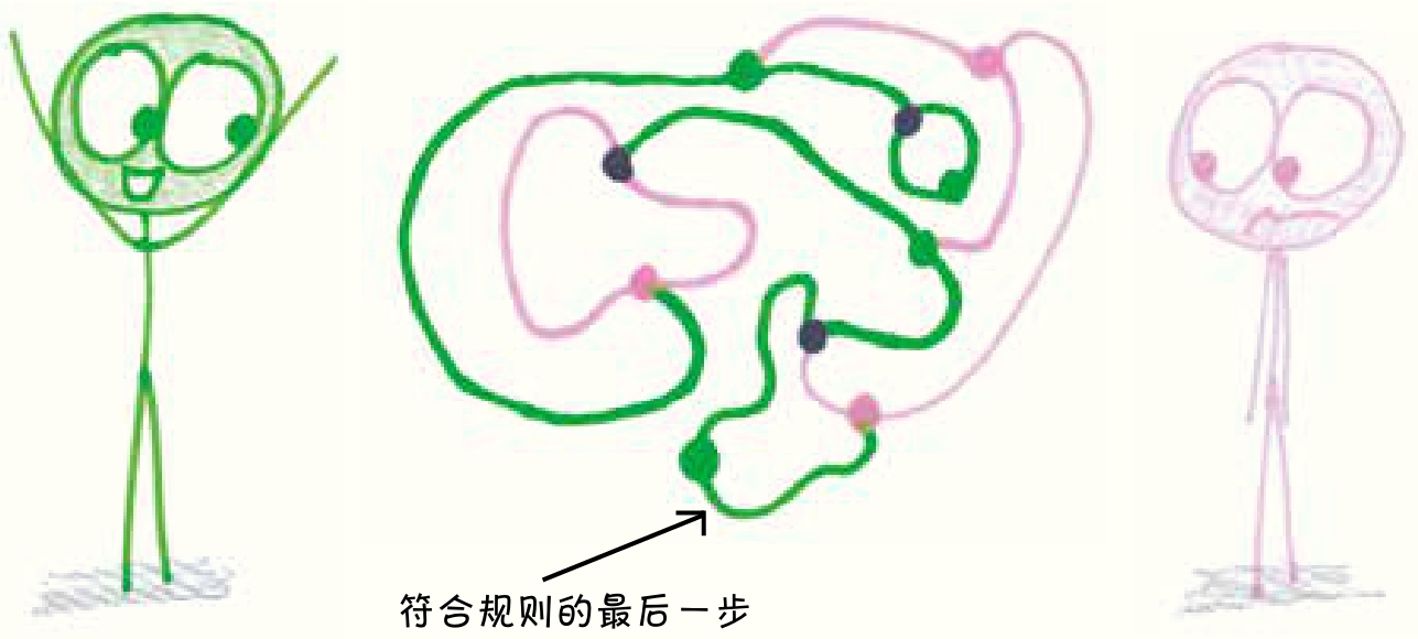 这是如何做到的呢?来,注意看,在游戏过程中,可连的末端数是不变的。每走一步就会消耗2个末端,然后再用2个新的末端替代它们。区域的数量则恰恰相反,大多数时候每走一步都会增加一个新的区域——除一些特殊的走法外。在有 n 个“十”字的游戏中,将有( n -1)步是用于连接之前未连接过的“十”字,这( n -1)步都不会增加任何新区域。