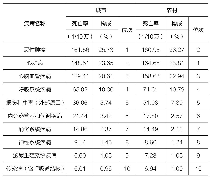 近些年,随着经济社会的发展和人民生活质量的改善,中国的疾病谱也发生了很大变化,肿瘤和代谢疾病等已经成为主要死因。数据显示(见表1-1),严重影响中国人生命安全的疾病主要是恶性肿瘤、心脏病和心脑血管疾病,这三大疾病造成的死亡率均在20%以上,占据了中国城乡疾病死亡率的70%左右。排名第四的是呼吸系统疾病,造成的死亡率也达到了10%以上;其他疾病造成的死亡率都在10%以下,排名第五到第十的分别是损伤和中毒、内分泌营养和代谢疾病、消化系统疾病、神经系统疾病、泌尿生殖系统疾病、传染病(含呼吸道结核)。