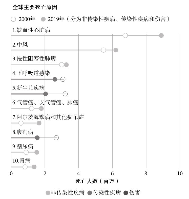 世界卫生组织发布的《全球卫生估计》报告显示 [11] ,2019年,在全球5540万死亡病例中,十大死因占55%。其中,最主要的死亡原因(按死亡总人数排列)与“心血管疾病(缺血性心脏病、中风)、呼吸系统疾病(慢性阻塞性肺病、下呼吸道感染)和新生儿疾病(出生窒息和出生创伤、新生儿败血症和感染以及早产并发症)”这三个大的主题有关。死亡原因可分为三类:传染性疾病、非传染性疾病(慢性)和伤害。