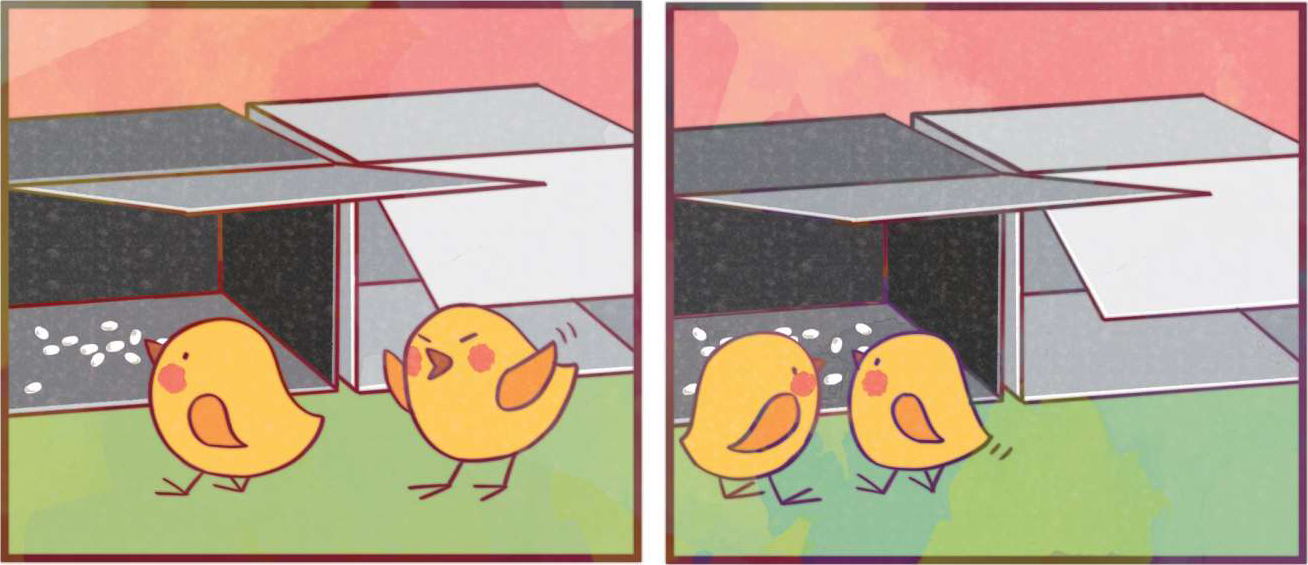 柯勒把浅灰色纸板换成了黑色纸板,其他不变,再次让小鸡们去找米吃。实验的结果是:70%的小鸡都去黑色纸板下面找米了!为什么会这样呢?